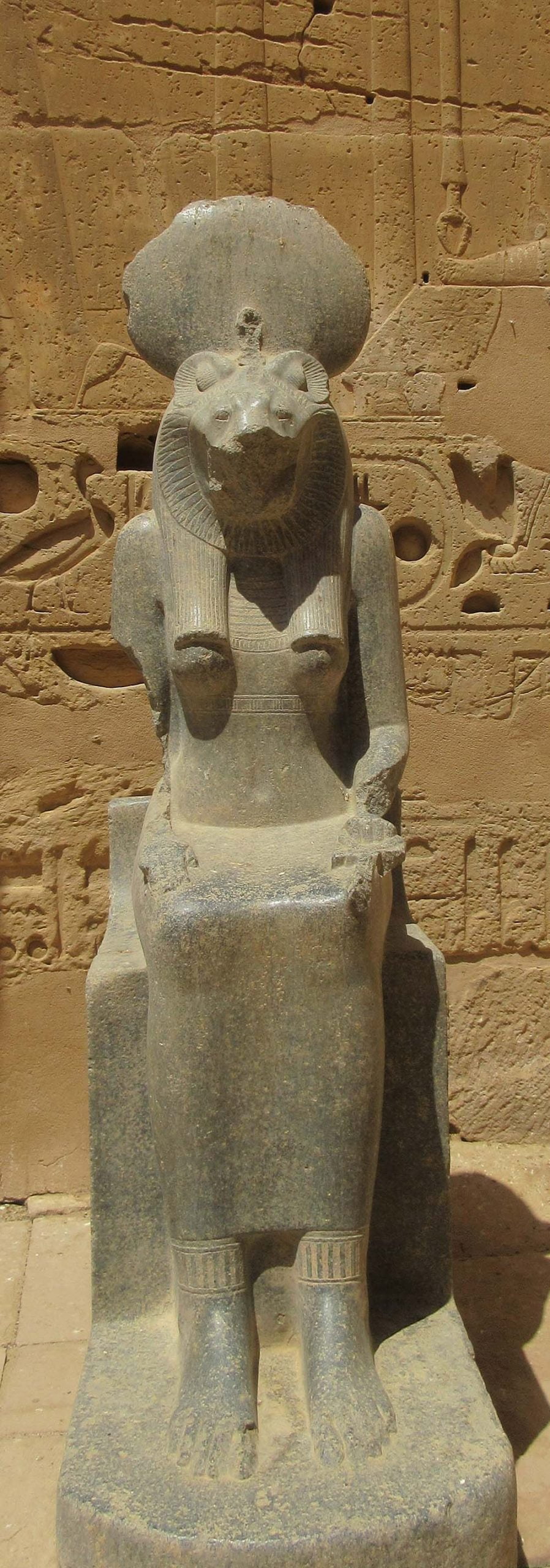 In Egyptian mythology, Sekhmet (/ˈsɛkˌmɛt/[1] or Sachmis (/ˈsækmɪs/), also spelled Sakhmet, Sekhet, or Sakhet, among other spellings, is a warrior goddess as well as goddess of healing. She is depicted as a lioness, the fiercest hunter known to the Egyptians. It was said that her breath formed the desert. She was seen as the protector of the pharaohs and led them in warfare.